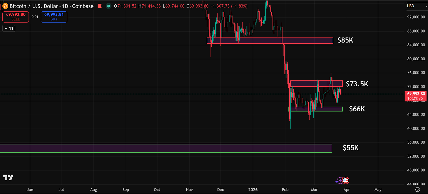 Every rally gets sold. Every bounce fades. The Iran conflict is driving the news cycle and the price is following headlines instead of structure, which makes it almost impossible to build conviction in either direction.